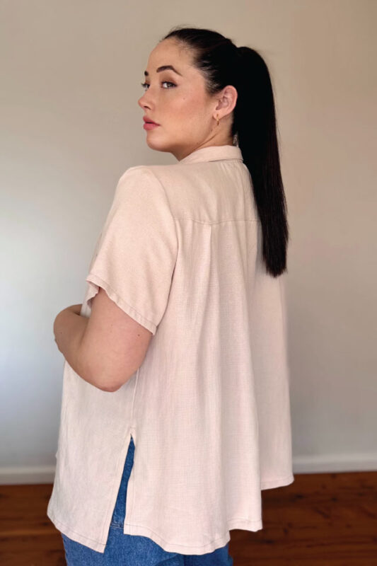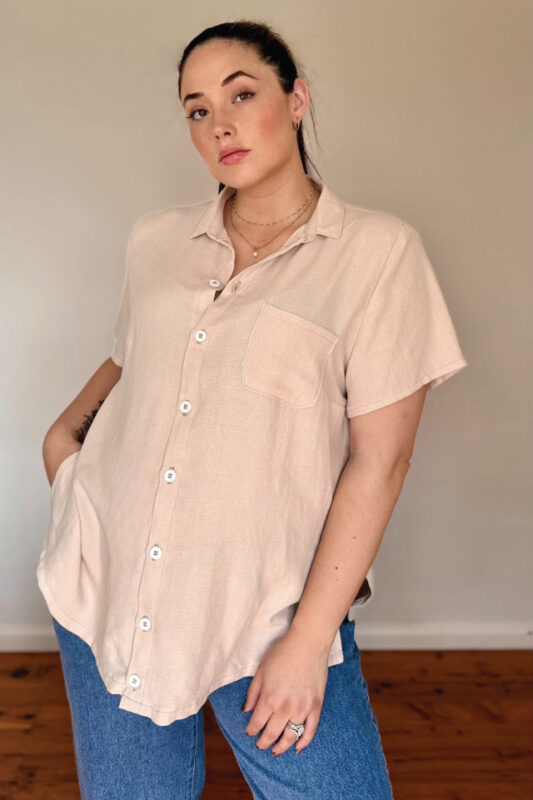 Hi everyone, I’m Steph from Sydney, Australia! I sewed up my Rylie shirt using a natural linen fabric and I made the short sleeve view with a front pocket. I love the oversized style of this top, it is perfect for pairing with a pair of jeans for that effortless cool vibe or make a matching pair of shorts for a cute summer set. My best advice when sewing the Rylie is to use a good point turner tool to get those crisp corners in your collars. I plan to next make the Rylie in the long-gathered sleeve with a cuff.