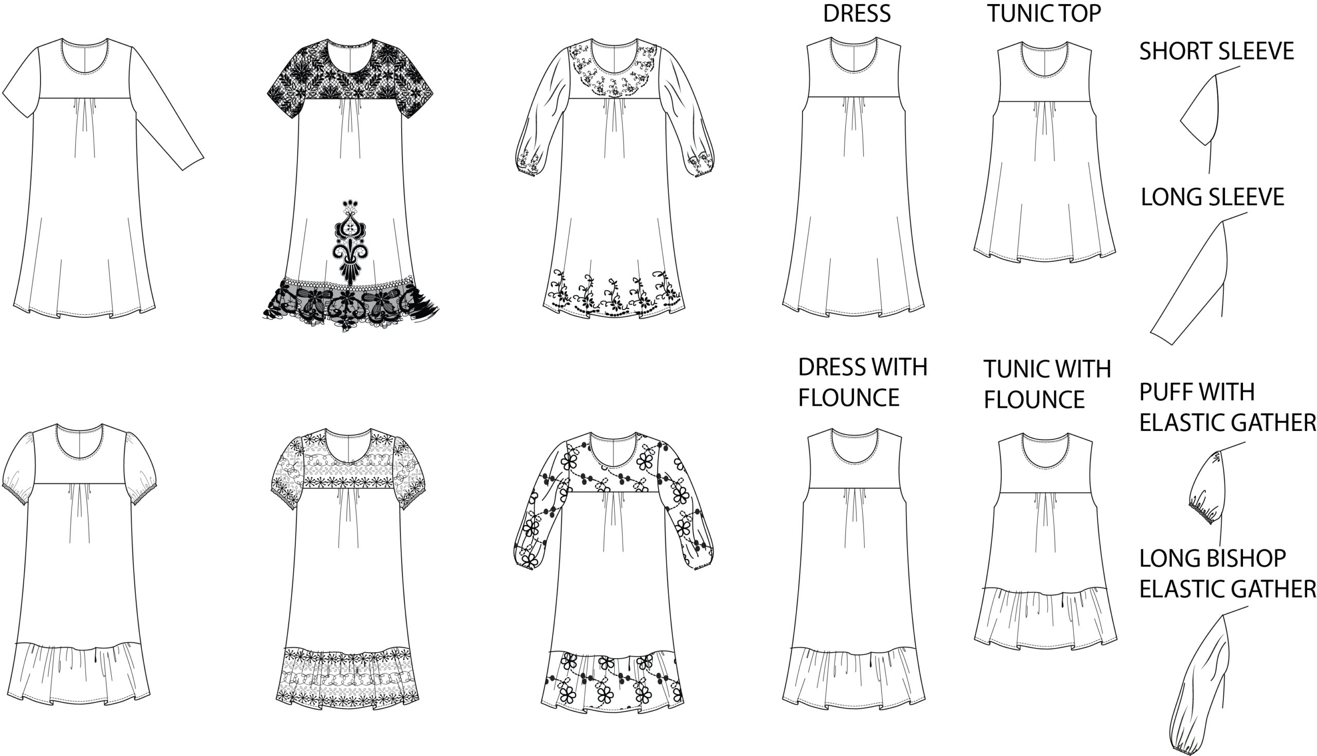 Frida offers the choice of top length, tunic length, top with gathered ruffle, tunic with gathered ruffle, dress with gathered ruffle or full length dress.