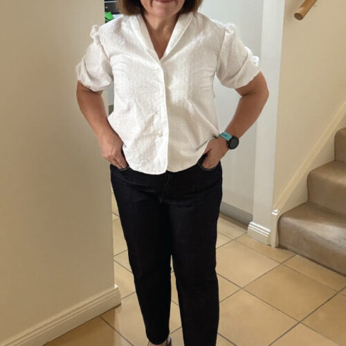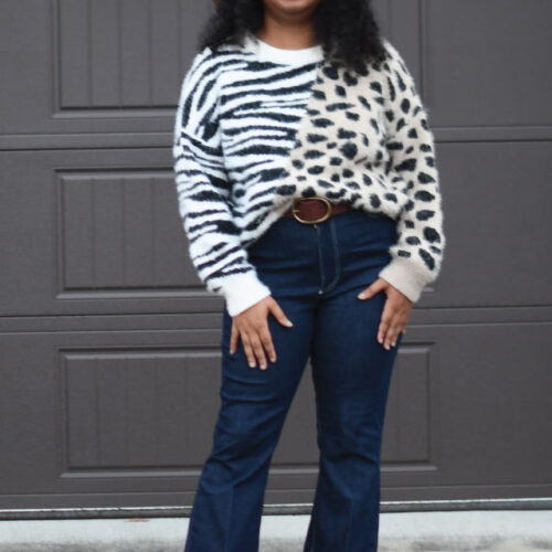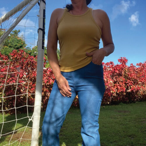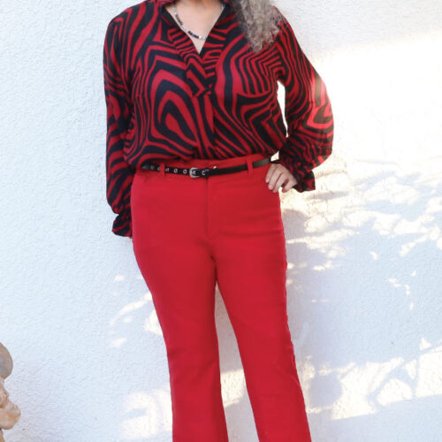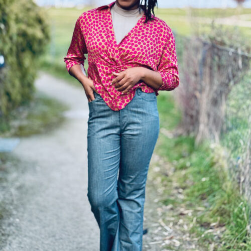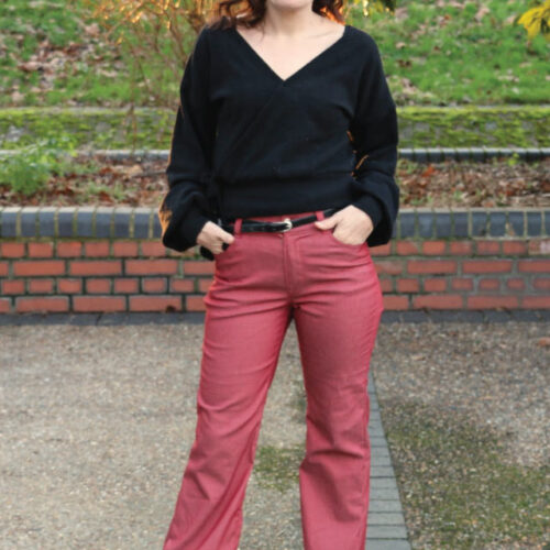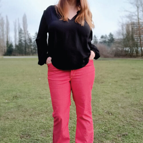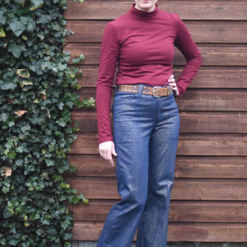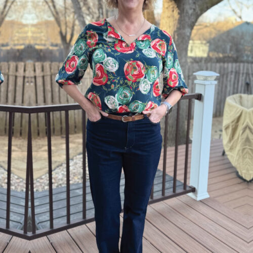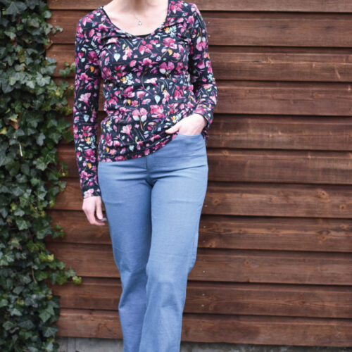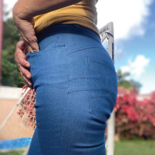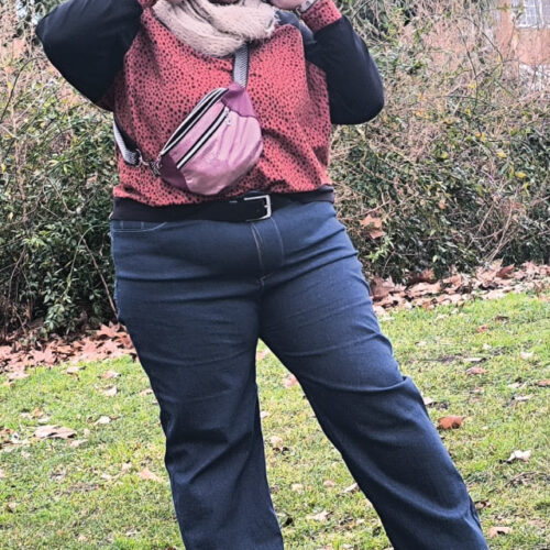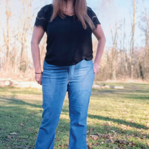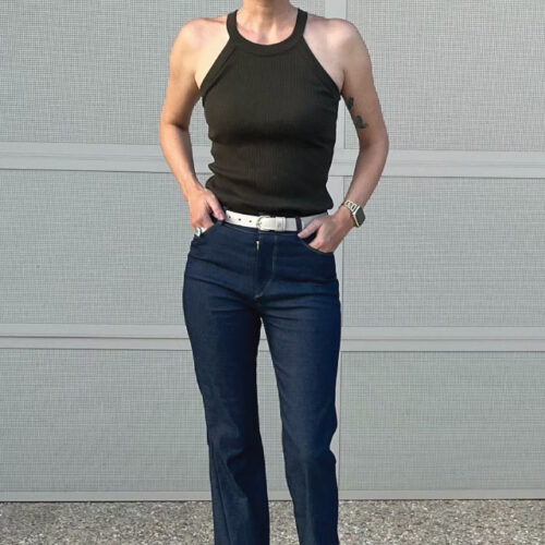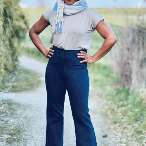 I’m tall and muscular (I lift weights!) and my regular jeans no longer fit. I wanted to try the Peyton Jeans because of the dart shaping in the seat. I chose to make the straight leg version in dark denim with stretch and am thrilled with the results! I used 3/8 inch seams throughout, mainly so I could make sure they fit through the thighs. The only change I made was to the waistband – the curved waistband didn’t work for me because it was too tight. I removed it and made a straight waistband that fits perfectly! I love these jeans and am looking forward to making more!