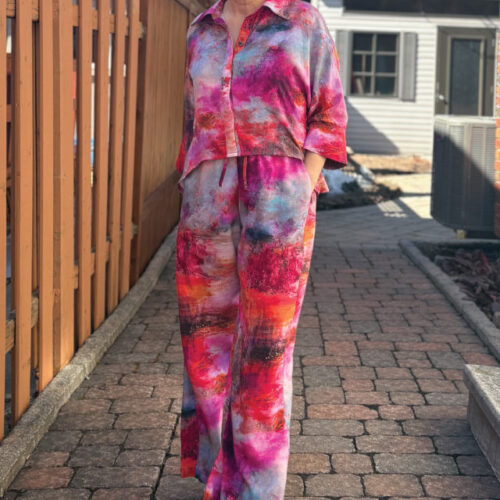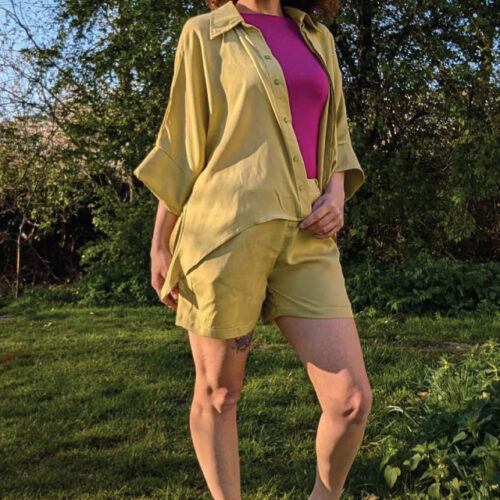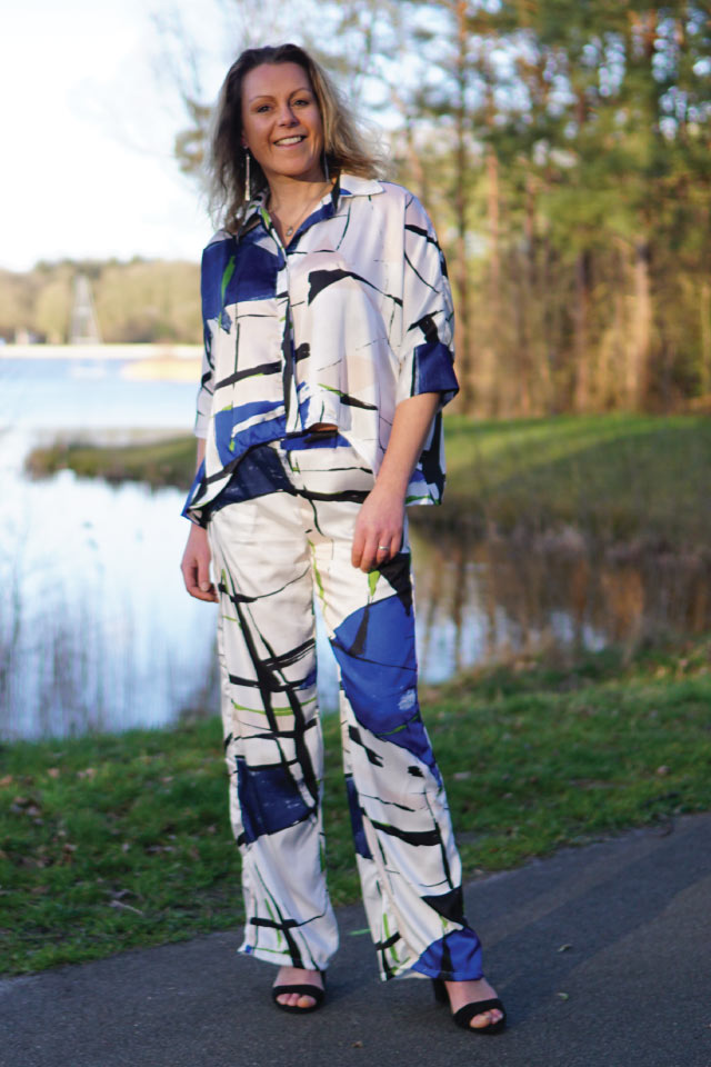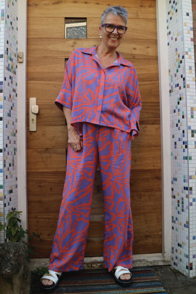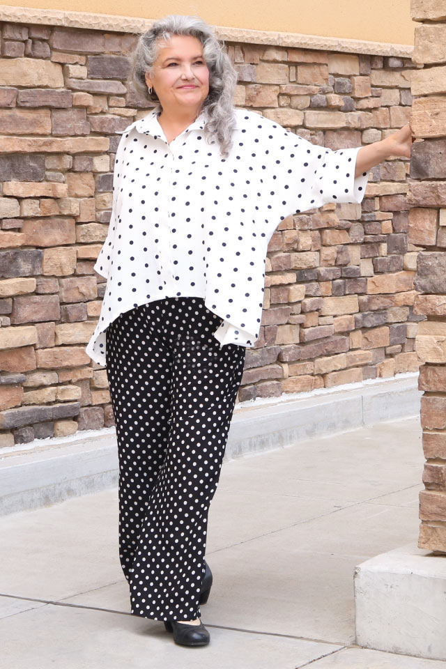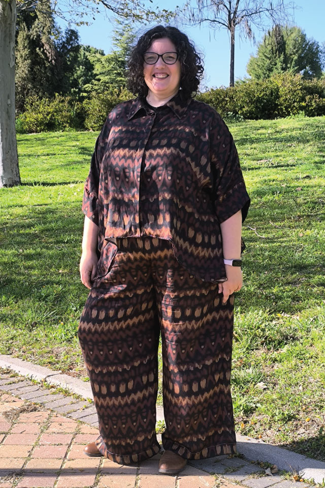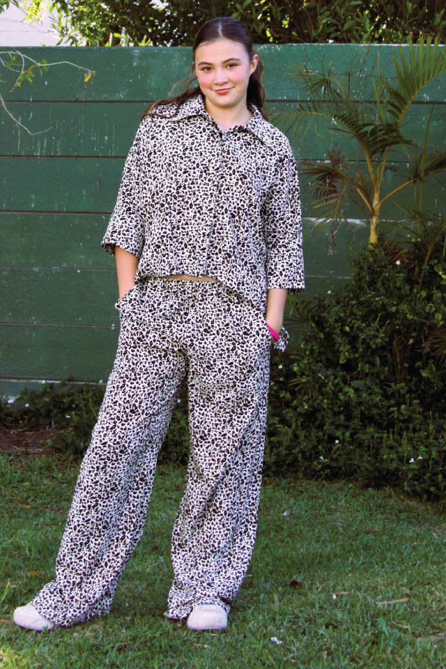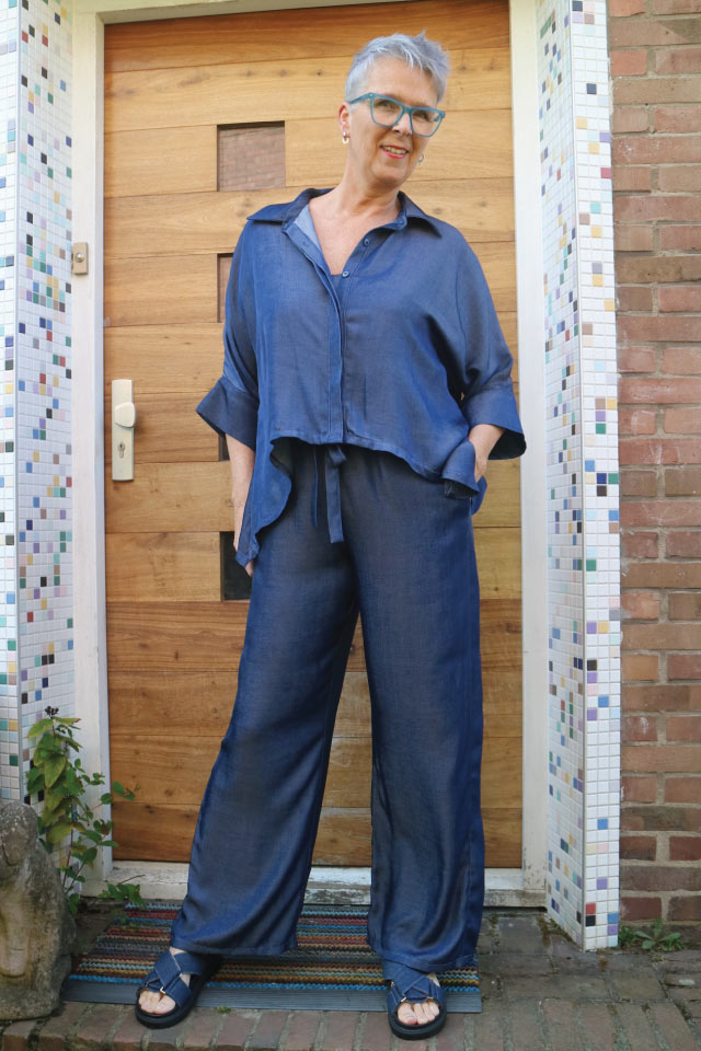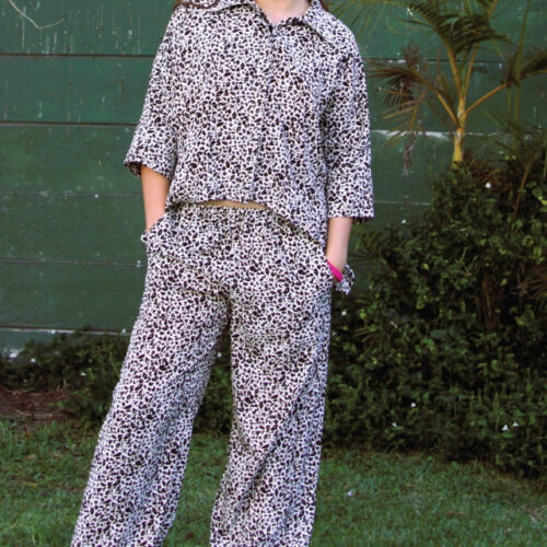 The shirt is oversized, so it needs a really soft fabric. And the pants also need to be soft and flowing.